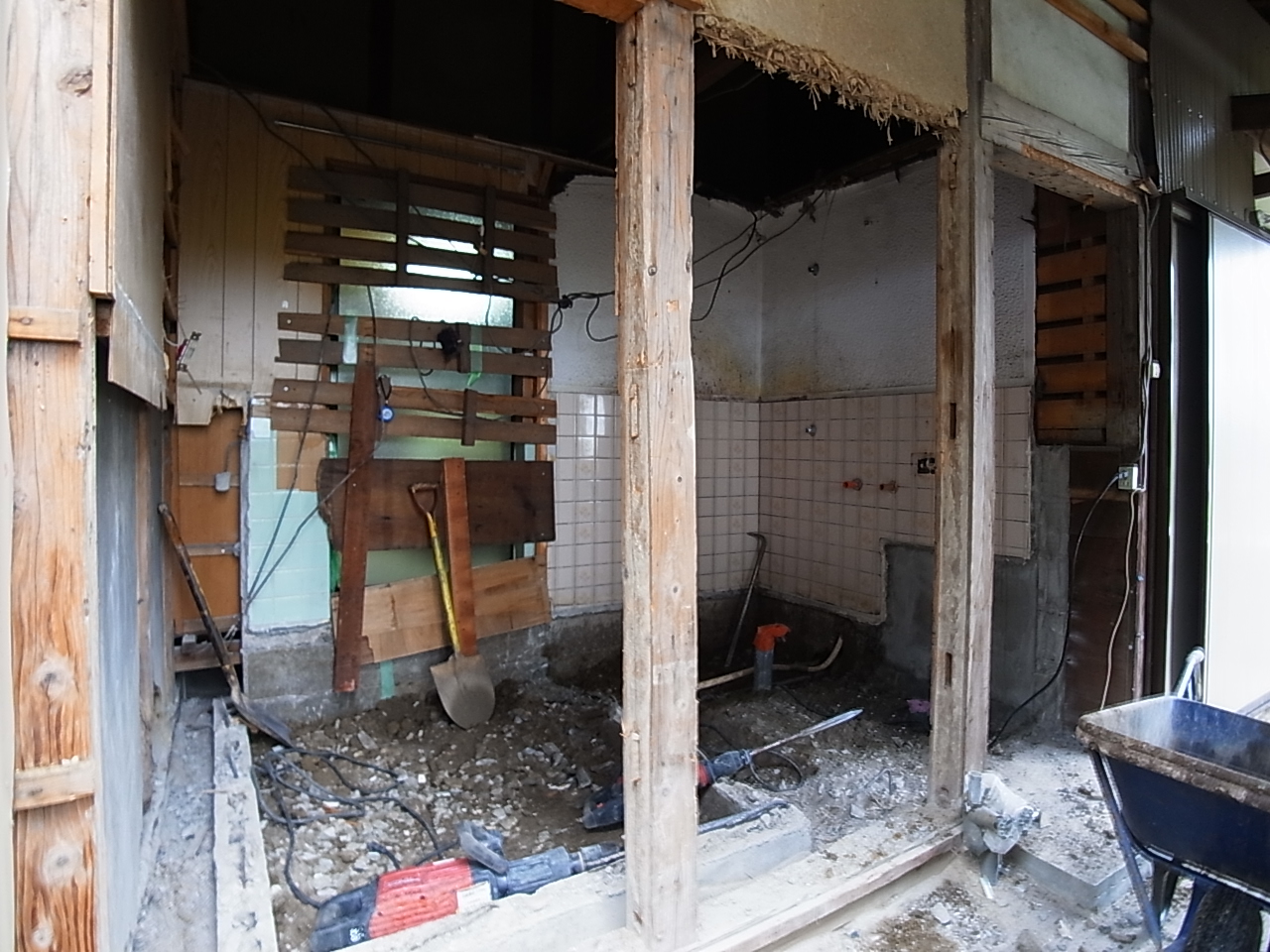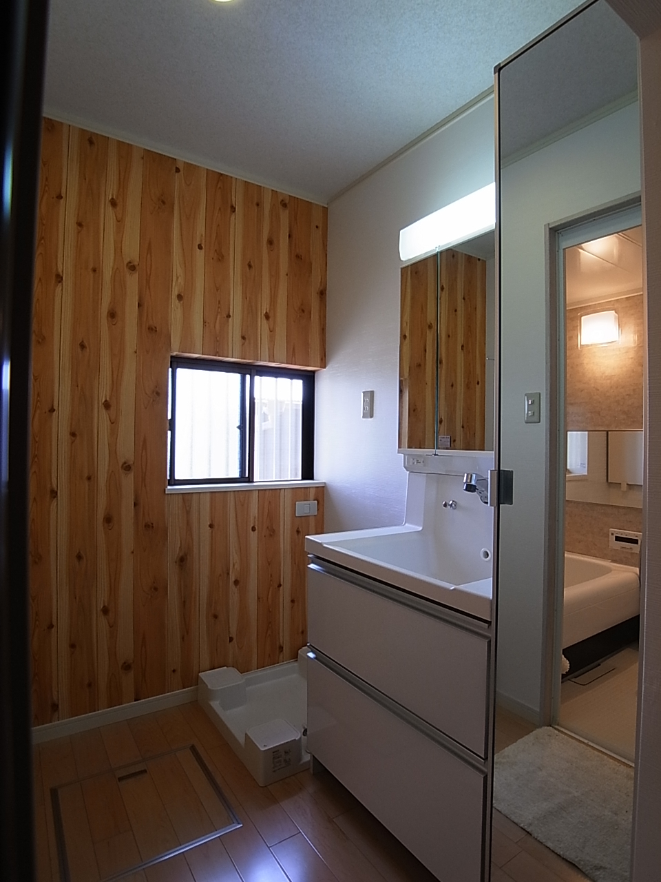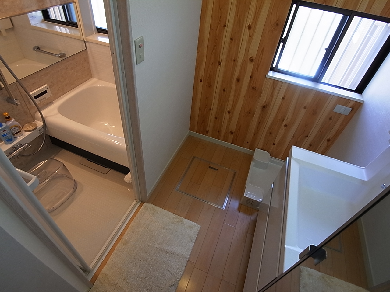 | 施工前:在来式の寒いお風呂です。 | 施工前:洗面所です。 | 施工前:。洗面所の入り口です。 |