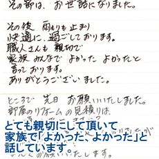リフォームラボ いとねんでは、工事終了後のお客様に私たちの行ったリフォーム工事についてお手紙によるお声を聞かせて
