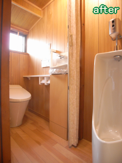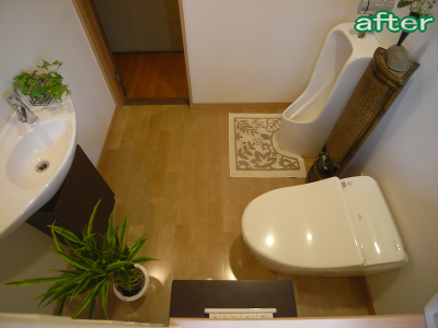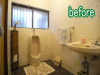 | もともと和式便器と小便器に別れていました。壁を取って、一つのスペースにして洋便器を取り付けました。それに伴って掃除が大変だった2つの窓を1つにしました。床は40p角のタイルを貼ったことで、豪華になりました。 |