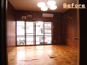 | 上の写真の反対側から見た図です。食器棚のある部分は土間で、施工後キッチンになります |